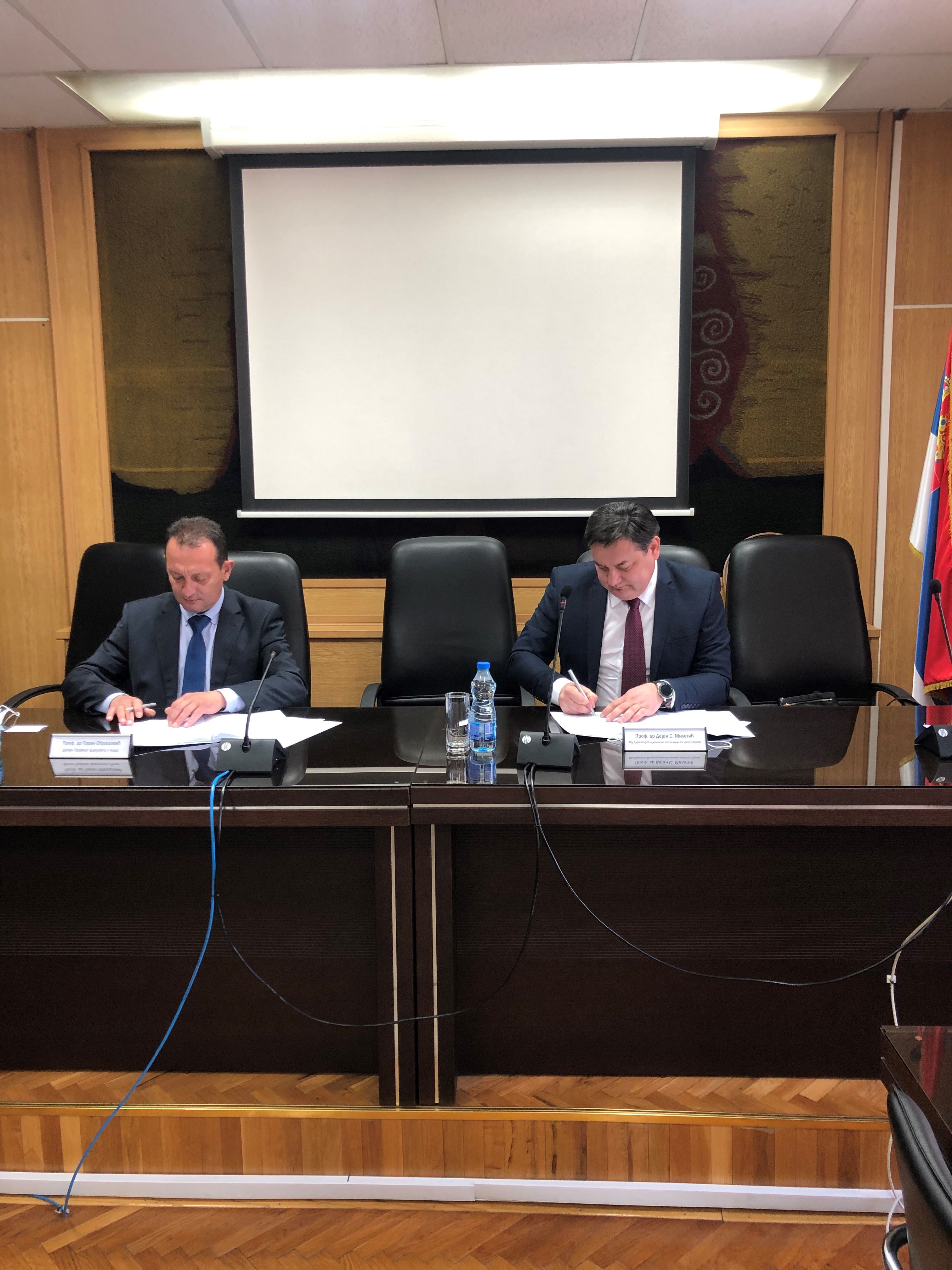 Данас је у Нишу потписан Споразум о сарадњи између Националне академије за јавну управу и Правног факултета Универзитета у Нишу. Потписивањем овог Споразума, још једна кредибилна високошколска институција уписала се на листу партнера НАЈУ. Споразум су потписали в.д. директора НАЈУ, Дејан Милетић и декан Правног факултета Универзитета у Нишу, Проф. Др. Горан Обрадовић.