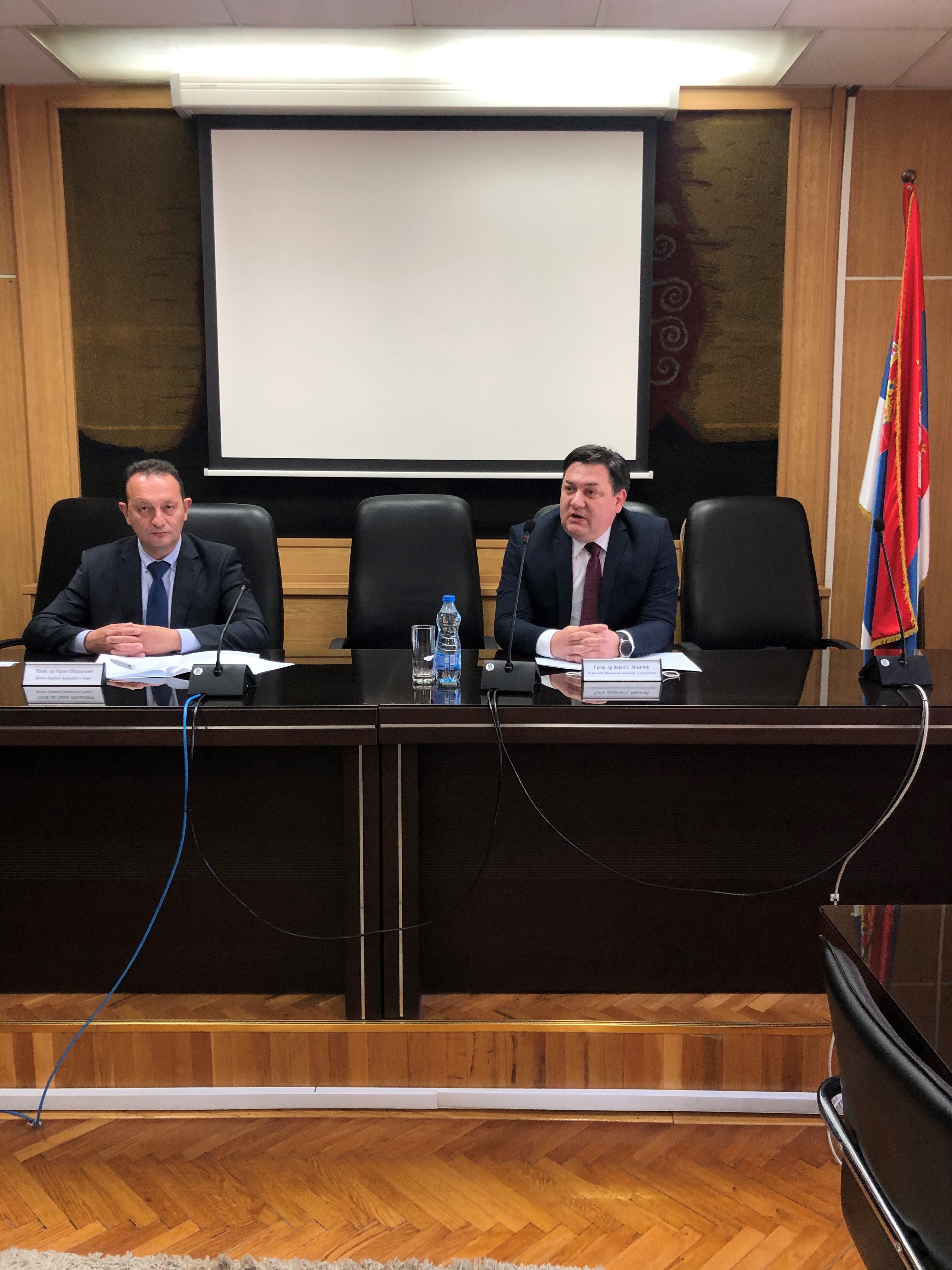 „Изузетно ме радује чињеница да се проширује мрежа високообразовних институција са којима Академија успоставља сарадњу и да се на листи партнера од данас налази и Правни факултет Универзитета у Нишу. Овај Споразум допринеће размени информација и искустава у питањима везаним за науку и праксу у области правних наука. Планирано је и учествовање професора Факултета у извођењу појединих обука које организује и спроводи Национална академија, организовање предавања за иновацију знања, организовање ваннаставних активности студентима завршних година основних и мастер академских студија у којима би се студенти упознали са праксом рада јавне управе, пре свега државних органа, органа државне управе и јединица локалне самоуправе, а планирали смо и организовање и учешће у заједничким стручним скуповима посвећеним актуелним темама, заједничко спровођење истраживачких активности, рад на научно-истраживачким пројектима и објављивање научних и стручних радова у заједничким публикацијама,“ изјавио је приликом потписивања в.д. директора НАЈУ, Дејан Милетић.
